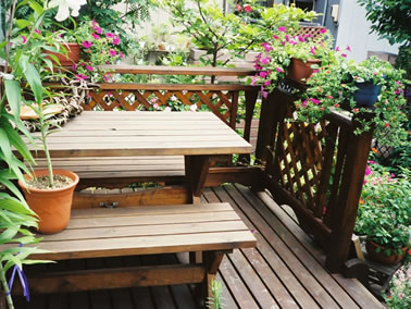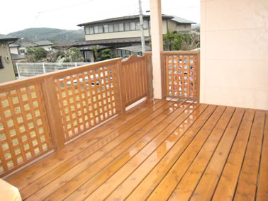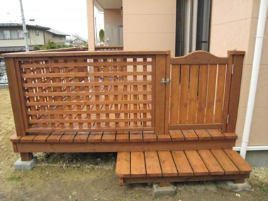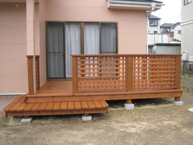 庭に面した1階にウッドデッキを新設。小さなお子様が外に飛び出さないように鍵を設置。段差も高さを考慮した安全設計に致しました。